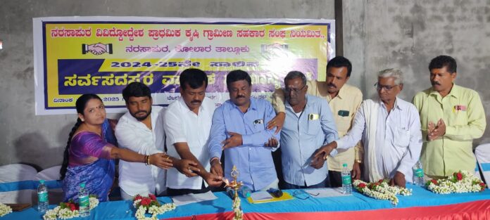 ತಾಲೂಕಿನ ನರಸಾಪುರ ಗ್ರಾಮದ ಸಹಕಾರ ಸಂಘದ ಆವರಣದಲ್ಲಿ ಏರ್ಪಡಿಸಿದ್ದ 2024 – 25 ನೇ ಸಾಲಿನ ಸರ್ವ ಸದಸ್ಯರ ವಾರ್ಷಿಕ ಸಾಮಾನ್ಯ ಸಭೆಯಯನ್ನು ಉದ್ಘಾಟಿಸಿ ಮಾತನಾಡಿದ ಅವರು ರೈತರು ಎಲ್ಲರೂ ಸೇರಿ ನೂತನ ಕಟ್ಟಡವನ್ನು ನಿರ್ಮಾಣ ಮಾಡಬೇಕೆಂದು ಆಸೆ ಇತ್ತು ನಾನು 2016 ರಲ್ಲಿ ಅಧ್ಯಕ್ಷನಾದ ಸಂದರ್ಭದಲ್ಲಿ ಕಟ್ಟಡ ನಿರ್ಮಾಣ ಮಾಡುವ ಸ್ಥಿತಿಯಲ್ಲಿ ಇರಲಿಲ್ಲ, ನಾವು ಅಧಿಕಾರ ವಹಿಸಿಕೊಂಡ ಸಂದರ್ಭದಲ್ಲಿ ಸಾಲ ವಿತರಣೆ ಕಡಿಮೆ ಇತ್ತು, ಸುಮಾರು 25 ಲಕ್ಷ ಮಾತ್ರ ಇತ್ತು, ನಾವು ಅಧಿಕಾರ ಸ್ವೀಕರಿಸಿದ ನಂತರ ನಮ್ಮ ಅವಧಿಯಲ್ಲಿ ಸುಮಾರು 800 ರೈತರಿಗೆ 10 ಕೋಟಿ ಕೆಸಿಸಿ ಸಾಲ ಕೊಡಿಸಲಾಗಿತ್ತು, ಆ ಕೆಸಿಸಿ ಸಾಲದಲ್ಲಿ ಸುಮಾರು 6.50 ಕೋಟಿ ಸಾಲ ಮನ್ನಾ ಮಾಡಲಾಗಿದೆ ಎಂದರು