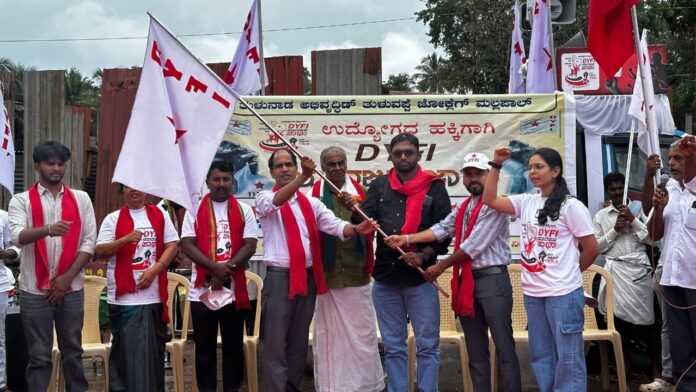 ʼಉದ್ಯೋಗ ಸೃಷ್ಟಿಸಿʼ, ʼಸ್ಥಳೀಯರಿಗೆ ಉದ್ಯೋಗದಲ್ಲಿ ಆದ್ಯತೆ ನೀಡಿʼ ಸೇರಿದಂತೆ ಹಲವು ಘೋಷಣೆಗಳೊಂದಿಗೆ ಡಿವೈಎಫ್ಐ ನೇತೃತ್ವದ ಯುವಜನ ಜಾಥಾಕ್ಕೆ ಬೆಳ್ತಂಗಡಿ ಬಸ್ ನಿಲ್ದಾಣದಲ್ಲಿ ಚಾಲನೆ ನೀಡಲಾಯಿತು.