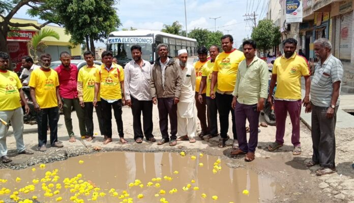 ಚಿಂತಾಮಣಿ | ರಸ್ತೆ ಗುಂಡಿಗೆ ಪೂಜೆ ಮಾಡಿ ಕೆಆರ್‌ಎಸ್ ಪಕ್ಷದ ವಿನೂತನ ಪ್ರತಿಭಟನೆ