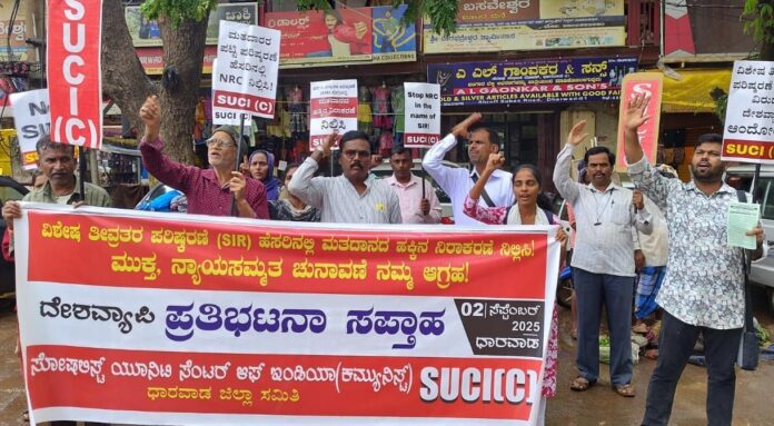 ದೇಶದಲ್ಲಿ ಅತ್ಯಂತ ವಿವಾದಕ್ಕೆ ಒಳಗಾದ ಮತ್ತು ದುಡಿಯುವ ಜನರ ಮೂಲಭೂತ ಹಕ್ಕುಗಳಿಗೆ ಸಂಚಕಾರ ತರುತ್ತಿರುವ ಆರೋಪದ ಮೇಲೆ SIR ಅನ್ನು ಕೈ ಬಿಡುವಂತೆ ಕೇಂದ್ರ ಚುನಾವಣಾ ಆಯೋಗವನ್ನು ಒತ್ತಾಯಿಸಿ, ಎಸ್ಯುಸಿಐ ಕಮ್ಯುನಿಸ್ಟ್ ಪಕ್ಷದ ಧಾರವಾಡ ಜಿಲ್ಲಾ ಸಮಿತಿ ವತಿಯಿಂದ ನಗರದ ವಿವೇಕಾನಂದ ವೃತ್ತದಲ್ಲಿ SIR ಮತಪಟ್ಟಿಯ ತೀವ್ರತಮ ಪರಿಷ್ಕರಣೆ ವಿರುದ್ಧ ಪ್ರತಿಭಟನೆ ನಡೆಸಲಾಯಿತು.