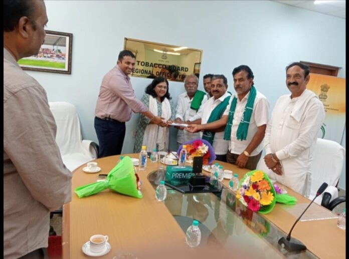 ಮೈಸೂರಿನ ಪ್ರಾದೇಶಿಕ ತಂಬಾಕು ಮಂಡಳಿ ವಲಯ ಕಚೇರಿಯಲ್ಲಿ ಭಾರತ ಸರ್ಕಾರದ ತಂಬಾಕು ಮಂಡಳಿ ಕಾರ್ಯಕಾರಿ ನಿರ್ದೇಶಕರಾದ ವಿಶ್ವಶ್ರೀಯವರನ್ನು ಕರ್ನಾಟಕ ರಾಜ್ಯ ರೈತ ಸಂಘದ ಜಿಲ್ಲಾಧ್ಯಕ್ಷರಾದ ಹೊಸೂರು ಕುಮಾರ್ ನೇತೃತ್ವದ ನಿಯೋಗ ಭೇಟಿ ಮಾಡಿ ರೈತರ ಮೇಲಿನ ದಂಡದ ಶುಲ್ಕವನ್ನು ಮನ್ನಾ ಮಾಡಬೇಕೆಂದು ಮನವಿ ಪತ್ರ ಸಲ್ಲಿಸಿದರು.