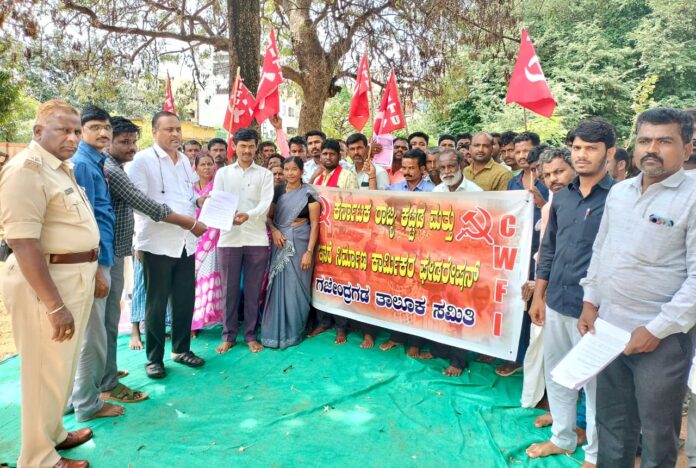 ಗದಗ ಜಿಲ್ಲೆಯ ಗಜೇಂದ್ರಗಡ ಪಟ್ಟಣದ ತಹಶೀಲ್ದಾರ್ ಕಚೇರಿ ಎದುರು ಕರ್ನಾಟಕ ರಾಜ್ಯ ಕಟ್ಟಡ ಮತ್ತು ಇತರೆ ನಿರ್ಮಾಣ ಕಾರ್ಮಿಕರ ಫೇಡರೇಷನ್ನಿಂದ ಪ್ರತಿಭಟನೆ ನಡೆಸಿ ತಹಶೀಲ್ದಾರ್ ಕಿರಣಕುಮಾರ ಕುಲಕರ್ಣಿ ಮತ್ತು ಕಾರ್ಮಿಕ ಇಲಾಖೆ ಸಿಬ್ಬಂದಿ ಆನಂದ ಅವರ ಮೂಲಕ ಕಾರ್ಯದರ್ಶಿಗಳು ಹಾಗೂ ಮುಖ್ಯ ಕಾರ್ಯನಿರ್ವಾಹಕ ಅಧಿಕಾರಿಗಳಿಗೆ ಮನವಿ ಸಲ್ಲಿಸಿದರು.