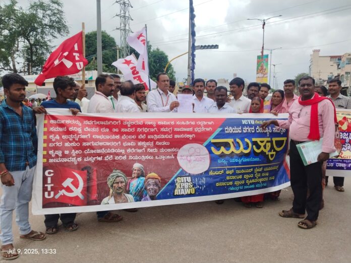 ಕೇಂದ್ರ ಮತ್ತು ರಾಜ್ಯ ಸರ್ಕಾರಗಳು ರೈತ- ಕಾರ್ಮಿಕ ವಿರೋಧಿ ನೀತಿಗಳನ್ನು ಜಾರಿಗೊಳಿಸುತ್ತಿರುವುದರ ವಿರುದ್ಧ ಇಂದು ದೇಶವ್ಯಾಪ್ತಿ ಸಾರ್ವತ್ರಿಕ ಮುಷ್ಕರ ಭಾಗವಾಗಿ ಗದಗ ಜಿಲ್ಲೆಯ ಗಜೇಂದ್ರಗಡದ ಕೆ ಕೆ ವೃತ್ತದಲ್ಲಿ ರೈತ ಕಾರ್ಮಿಕರ ಬೇಡಿಕೆಗಳನ್ನು ಈಡೇರಿಸುವಂತೆ ಸಿಐಟಿಯು ವತಿಯಿಂದ ಮಾನವ ಸರಪಳಿ ರಚಿಸಿ ಪ್ರತಿಭಟಿಸಿ ತಹಶಿಲ್ದಾರರ ಮೂಲಕ ರಾಷ್ಟ್ರಪತಿಗಳಿಗೆ ಮತ್ತು ಮಾನ್ಯ ಮುಖ್ಯಮಂತ್ರಿಗಳಿಗೆ ಮನವಿ ಸಲ್ಲಿಸಿ ಮಾತನಾಡಿದರು.