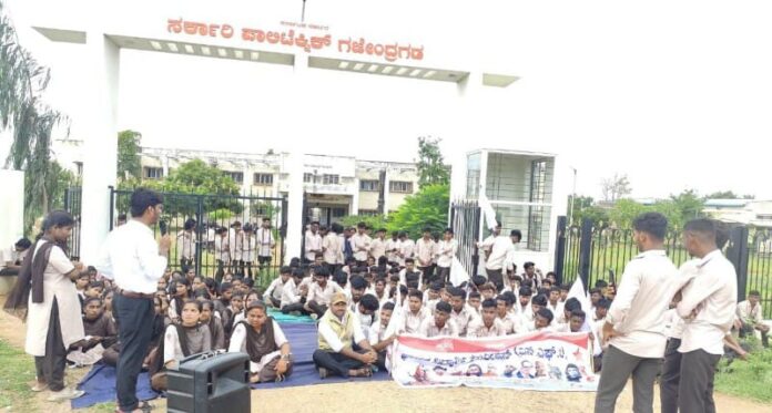 ಗದಗ ಜಿಲ್ಲೆಯ ಗಜೇಂದ್ರಗಡ ಪಟ್ಟಣದ ಸರಕಾರಿ ಪಾಲಿಟೆಕ್ನಿಕ್ ಕಾಲೇಜಿಗೆ ಮೂಲಭೂತ ಸೌಕರ್ಯಗಳನ್ನು ಒದಗಿಸುವಂತೆ ಭಾರತ ವಿದ್ಯಾರ್ಥಿ ಫೆಡರೇಷನ್ ತಾಲೂಕ ಸಮಿತಿ ನೇತೃತ್ವದಲ್ಲಿ ವಿದ್ಯಾರ್ಥಿಗಳು ತರಗತಿಗಳನ್ನು ಬಹಿಷ್ಕರಿಸಿ ಪ್ರತಿಭಟನೆ ನಡೆಸಿದರು.