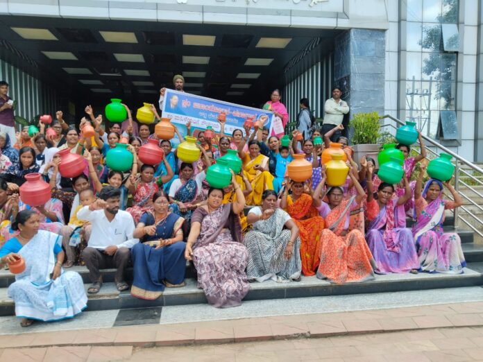 ಸೋಮವಾರ ನಗರದ ಸ್ಲಂ ಜನಾಂದೋಲನ ಕರ್ನಾಟಕ ಜಿಲ್ಲಾ ಘಟಕದಿಂದ ನಡೆದ ಪ್ರತಿಭಟನೆಯಲ್ಲಿ ಮಹಿಳೆಯರು ಕೈಯಲ್ಲಿ ಖಾಲಿ ಕೊಡ, ಚೊಂಬು ಹಿಡಿದು ಜಗತ್ ವೃತ್ತದಿಂದ ಮಹಾನಗರ ಪಾಲಿಕೆಯವರೆಗೆ ಪ್ರತಿಭಟನೆ ನಡೆಸಿ ಪಾಲಿಕೆಯ ಆಯುಕ್ತರಿಗೆ ಮನವಿ ಸಲ್ಲಿಸಿದರು.