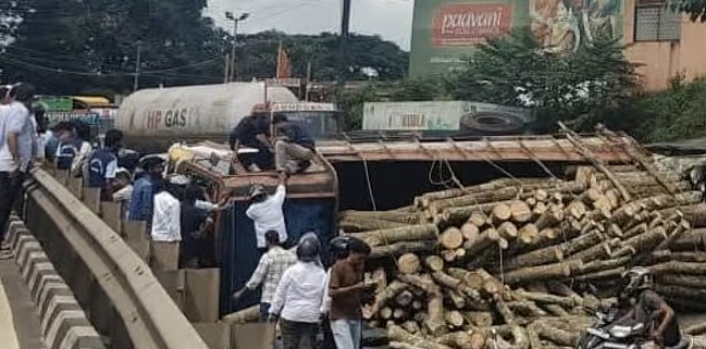 ಮರದ ದಿಮ್ಮಿಗಳನ್ನು ಸಾಗಾಟ ಮಾಡುತ್ತಿದ್ದ ಲಾರಿಯು ಚಾಲಕನ ನಿಯಂತ್ರಣ ತಪ್ಪಿ ರಸ್ತೆಯಲ್ಲಿ ಪಲ್ಟಿಯಾದ ಘಟನೆ ರಾ.ಹೆದ್ದಾರಿ 66ರ ಎಕ್ಕೂರಿನಲ್ಲಿ ನಡೆದಿದೆ. ಲಾರಿ ಪಲ್ಟಿಯಾದ್ದರಿಂದ ಹೆದ್ದಾರಿಯಲ್ಲಿ ಮರದ ದಿಮ್ಮಿಗಳು ಬಿದ್ದಿದ್ದ ಹಿನ್ನೆಲೆ ಕೆಲ ಕಾಲ ಟ್ರಾಫಿಕ್ ಜಾಮ್ ಉಂಟಾಗಿತ್ತು.