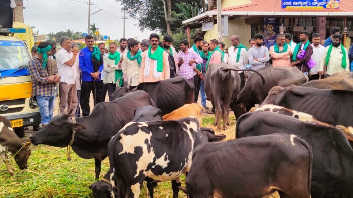 ಜಾನುವಾರುಗಳ ಮುಖಕ್ಕೆ ಅರಣ್ಯ ಸಚಿವರ ಮುಖವಾಡ ಅಳವಡಿಸುವ ಮೂಲಕ ವಿನೂತನವಾಗಿ ಪ್ರತಿಭಟಿಸಿದರು.