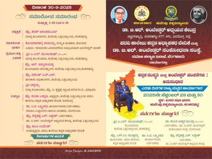 ಶಿವಮೊಗ್ಗ, “ಕನ್ನಡ ಸಂಸ್ಕೃತಿ ಮತ್ತು ಅಂಬೇಡ್ಕರ್ ಚಿಂತನೆಗಳು, : ಅನುಸಂಧಾನ” ಎಂಬ ಎರಡು ದಿನಗಳ ರಾಜ್ಯ ಮಟ್ಟದ ಕಾರ್ಯಾಗಾರವನ್ನು ಕುವೆಂಪು ವಿಶ್ವವಿದ್ಯಾಲಯದ ಡಾ. ಬಿ.ಆರ್. ಅಂಬೇಡ್ಕರ್ ಅಧ್ಯಯನ ಕೇಂದ್ರವು ಸಮಾಜ ಕಲ್ಯಾಣ ಇಲಾಖೆಯ ಡಾ. ಬಿ.ಆರ್. ಅಂಬೇಡ್ಕರ್ ಸಂಶೋಧನೆ, ತರಬೇತಿ ಹಾಗೂ ವಿಸ್ತರಣಾ ಕೇಂದ್ರ, ಬೆಂಗಳೂರು ಹಾಗೂ ಪದವಿ ಕಾಲೇಜು ಕನ್ನಡ ಅಧ್ಯಾಪಕರ ವೇದಿಕೆಯ ಸಹಾಯೋಗದಲ್ಲಿ 2025ರ ಸೆಪ್ಟಂಬರ್ 29 ಮತ್ತು 30 ರಂದು ಏರ್ಪಡಿಸಲಾಗಿದೆ.