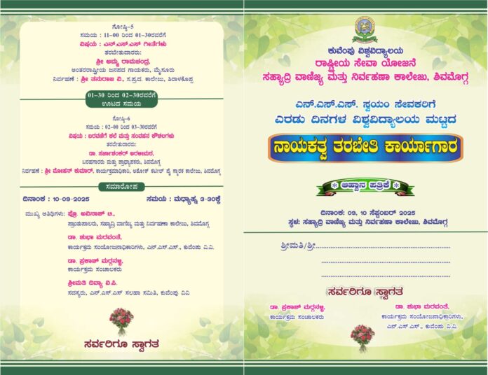 ಶಿವಮೊಗ್ಗ, ಕುವೆಂಪು ವಿವಿ, ರಾಷ್ಟ್ರೀಯ ಸೇವಾ ಯೋಜನೆ, ಸಹ್ಯಾದ್ರಿ ವಾಣಿಜ್ಯ ಮತ್ತು ನಿರ್ವಹಣಾ ಕಾಲೇಜು ಇವರ ಸಂಯುಕ್ತ ಆಶ್ರಯದಲ್ಲಿ ಸೆ. 9 ಮತ್ತು 10 ರಂದು ಎನ್ ಎಸ್ ಎಸ್ ಸ್ವಯಂ ಸೇವಕರಿಗೆ ಎರಡು ದಿನಗಳ ವಿ.ವಿ.ಮಟ್ಟದ ನಾಯಕತ್ವ ತರಬೇತಿ ಕಾರ್ಯಗಾರ ಆಯೋಜಿಸಲಾಗಿದೆ ಎಂದು ಕಾರ್ಯಕ್ರಮ ಸಂಚಾಲಕ ಡಾ. ಪ್ರಕಾಶ್ ಮರ್ಗನಳ್ಳಿ ಹಾಗೂ ಸಂಯೋಜಕರಾದ ಶುಭಮರವಂತೆ ತಿಳಿಸಿದ್ದಾರೆ.