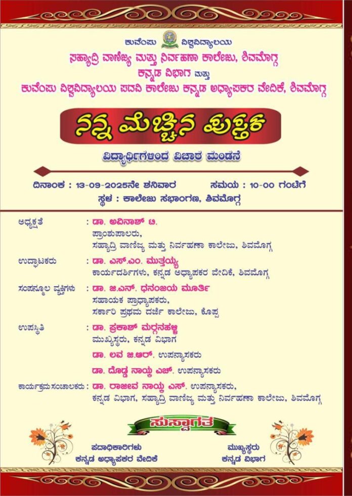 ಶಿವಮೊಗ್ಗದ ಸಹ್ಯಾದ್ರಿ ವಾಣಿಜ್ಯ ಮತ್ತು ನಿರ್ವಹಣಾ ಕಾಲೇಜಿನ ಕನ್ನಡ ವಿಭಾಗ ಹಾಗೂ ಕುವೆಂಪು ವಿವಿ ಪದವಿ ಕಾಲೇಜು ಕನ್ನಡ ಅಧ್ಯಾಪಕರ ವೇದಿಕೆ ವತಿಯಿಂದ ಸೆ. 13 ರಂದು ನನ್ನ ಮೆಚ್ಚಿನ ಪುಸ್ತಕ ಕಾರ್ಯಕ್ರಮ ಹಮ್ಮಿಕೊಳ್ಳಲಾಗಿದೆ ಎಂದು ಕನ್ನಡ ವಿಭಾಗದ ಮುಖ್ಯಸ್ಥ ಡಾ. ಪ್ರಕಾಶ್ ಮರ್ಗನಳ್ಳಿ ತಿಳಿಸಿದ್ದಾರೆ.