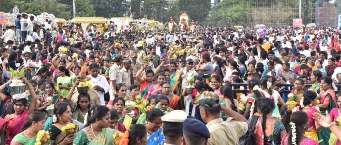 ಮೆರವಣಿಗೆಯಲ್ಲಿ ಸಾಗುತ್ತಿದ್ದ ಗ್ರಾಮ ದೇವತೆಗಳಿಗೆ ಹೆಲಿಕಾಪ್ಟರ್‌ನಿಂದ ಪುಷ್ಪಗಳ ಮಳೆಯನ್ನು ಸುರಿಸಲಾಯಿತು. ಆಕಾಶದಿಂದ ಸುರಿದ ಹೂವಿನ ಮಳೆಯು ಮೆರವಣಿಗೆಯ ಮಾರ್ಗದಲ್ಲಿದ್ದ ಜನರನ್ನು ಆನಂದಭರಿತರನ್ನಾಗಿಸಿತು. ಪುಷ್ಪಾರ್ಚನೆಯ ಸೊಬಗಿನಲ್ಲಿ ಹೂವಿನಿಂದ ಆವೃತವಾದ ದೇವರ ರಥಗಳು, ಅಂಬಾರಿ ಆನೆಗಳು, ಕಲಾತಂಡಗಳು ಎಲ್ಲವೂ ಜನಮನ ಸೆಳೆದವು.