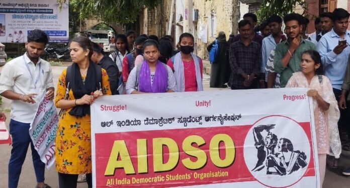ನಗರದ ಜಿಲ್ಲಾಧಿಕಾರಿ ಕಚೇರಿ ಎದುರು ಪದವಿ ವಿದ್ಯಾರ್ಥಿಗಳು ಸೇರಿ AIDSO ವಿದ್ಯಾರ್ಥಿ ಸಂಘಟನೆ ನೇತೃತ್ವದಲ್ಲಿ ಪ್ರತಿಭಟನೆ ನಡೆಸಿದರು.