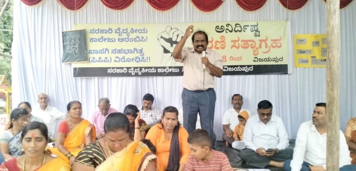ಎಐಯುಟಿಯುಸಿ ರಾಜ್ಯ ಕಾರ್ಯದರ್ಶಿ ಸೋಮಶೇಖರ ಯಾದಗಿರಿ ಮಾತನಾಡಿ, “ಸರ್ಕಾರಿ ವೈದ್ಯಕೀಯ ಕಾಲೇಜು ಸರ್ಕಾರದ ಸ್ವಾಧೀನದಲ್ಲಿ ಆಗಬೇಕು. ವಿಜಯಪುರದಲ್ಲಿ ಎಷ್ಟು ವರ್ಷಗಳಾದರೂ ಸರ್ಕಾರಿ ವೈದ್ಯಕೀಯ ಕಾಲೇಜು ಸ್ಥಾಪಿಸದಿದ್ದಕ್ಕೆ ಸರ್ಕಾರಕ್ಕೆ ನಾಚಿಕೆಯಾಗಬೇಕು. 150 ಎಕರೆ ಜಾಗ ಇದ್ದರೂ ಸರ್ಕಾರ ಸುಸಜ್ಜಿತ ವೈದ್ಯಕೀಯ ಕಾಲೇಜು ನಿರ್ಮಾಣ ಮಾಡಲು ಹಿಂದೇಟು ಹಾಕುತ್ತಿದೆ. ಪಿಪಿಪಿ ಅಡಿ ಕಾಲೇಜು ತರುತ್ತಿರುವುದನ್ನು ವಿರೋಧಿಸಿ ನಡೆಯುತ್ತಿರುವ ಹೋರಾಟಕ್ಕೆ ಸಂಪೂರ್ಣ ನಮ್ಮ ಕಾರ್ಮಿಕ ಸಂಘಟನೆ ಬೆಂಬಲವಿದೆ” ಎಂದರು.
