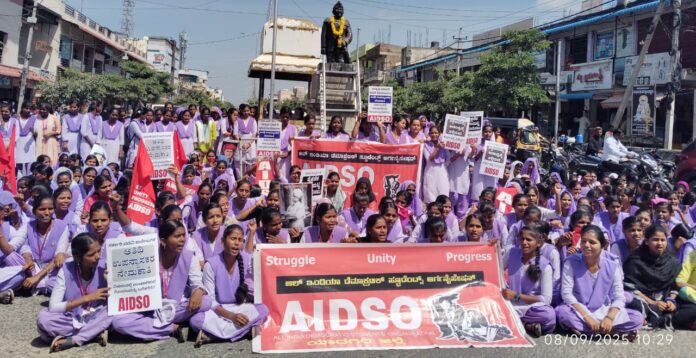 ರಾಜ್ಯಾದ್ಯಂತ ಅತಿಥಿ ಉಪನ್ಯಾಸಕರ ನೇಮಕಾತಿಯಲ್ಲಿ ಆಗಿರುವ ಗೊಂದಲ ನಿವಾರಣೆ ಹಾಗೂ ಪದವಿ ಉಪನ್ಯಾಸಕರ ನೇಮಕಕ್ಕೆ ಆಗ್ರಹಿಸಿ ಎಐಡಿಎಸ್ಒ ನೇತ್ರತ್ವದಲ್ಲಿ ನಗರದಲ್ಲಿ ಸೋಮವಾರ ಪ್ರತಿಭಟನೆ ನಡೆಯಿತು.