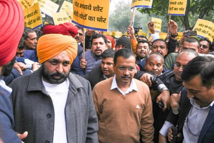 ಪಂಜಾಬ್ ಮುಖ್ಯಮಂತ್ರಿ ಭಗವಂತ್ ಮಾನ್ ಜೊತೆಗೂಡಿ, ದೆಹಲಿ ಸಿಎಂ ಅರವಿಂದ್ ಕೇಜ್ರಿವಾಲ್ ದೆಹಲಿಯ ಪಕ್ಷದ ಕಚೇರಿಯಲ್ಲಿ ನಡೆದ ಪ್ರತಿಭಟನೆಯಲ್ಲಿ ಪಕ್ಷದ ಕಾರ್ಯಕರ್ತರನ್ನು ಉದ್ದೇಶಿಸಿ ಮಾತನಾಡಿದರು.