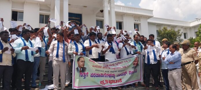 ಕೋಲಾರ: ಎಸ್ಸಿ, ಎಸ್ಟಿ ಹಾಗೂ ಹಿಂದುಳಿದ ವರ್ಗಗಳ ಗುತ್ತಿಗೆದಾರರಿಗೆ ಪ್ಯಾಕೇಜ್ ಕಾಮಗಾರಿಗಳಿಂದ ಆಗುತ್ತಿರುವ ಅನ್ಯಾಯ ಹಾಗೂ ಗುತ್ತಿಗೆ ಮೀಸಲಾತಿ ಆದೇಶವನ್ನು ಹರಿದುಹಾಕಿ ಸರ್ಕಾರದ ಕ್ರಮವನ್ನು ಖಂಡಿಸಿ ಜಿಲ್ಲಾ ಎಸ್ಸಿ ಎಸ್ಟಿ ಗುತ್ತಿಗೆದಾರರ ಸಂಘದಿಂದ ಬುಧವಾರ ನಗರದ ಹೊರವಲಯದ ಜಿಲ್ಲಾಧಿಕಾರಿ ಕಛೇರಿ ಮುಂದೆ ಪ್ರತಿಭಟನೆ ನಡೆಸಿದರು.